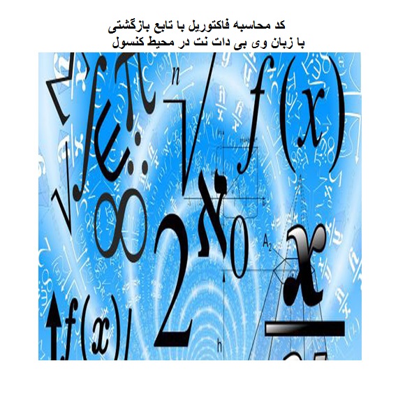 این پروژه یک سورس کد آماده به زبان برنامه نویسی وی بی دات نت یا زبان vb.net می باشد که در محیط نرم افزار ویژوال استدیو حالت کنسول نوشته شده است. در این پروژه یک عدد از کاربر دریافت می شود و سپس فاکتوریل آن عدد با استفاده از یک تابع بازگشتی محاسبه شده و در خروجی نمایش داده می شود. برای مثال اگر کاربر عدد 4 را وارد نموده و اینتر کنید فاکتوریل آن عدد محاسبه شده و خروجی 24 روی صفحه مانیتور چاپ می شود. پس از پرداخت هزینه پروژه لینک دانلود برای شما فرستاده می شود.قیمت این محصول با کد(11190) ، 52.000تومان می باشد برای خرید لطفا با این شماره 09356905712 در وات ساپ پیام بدید یا تماس بگیرید . در صورت نیاز به تغییر یا سفارش پروژه یا پاورپونت جدید با ما تماس بگیرید. کلمات کلیدی دانلود پروژه خرید پروژه دانشجویی سفارش پروژه